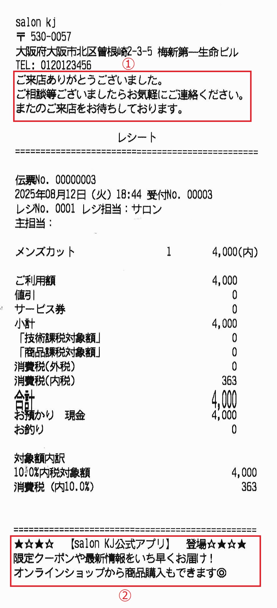 ②レシート下部に印字できます。