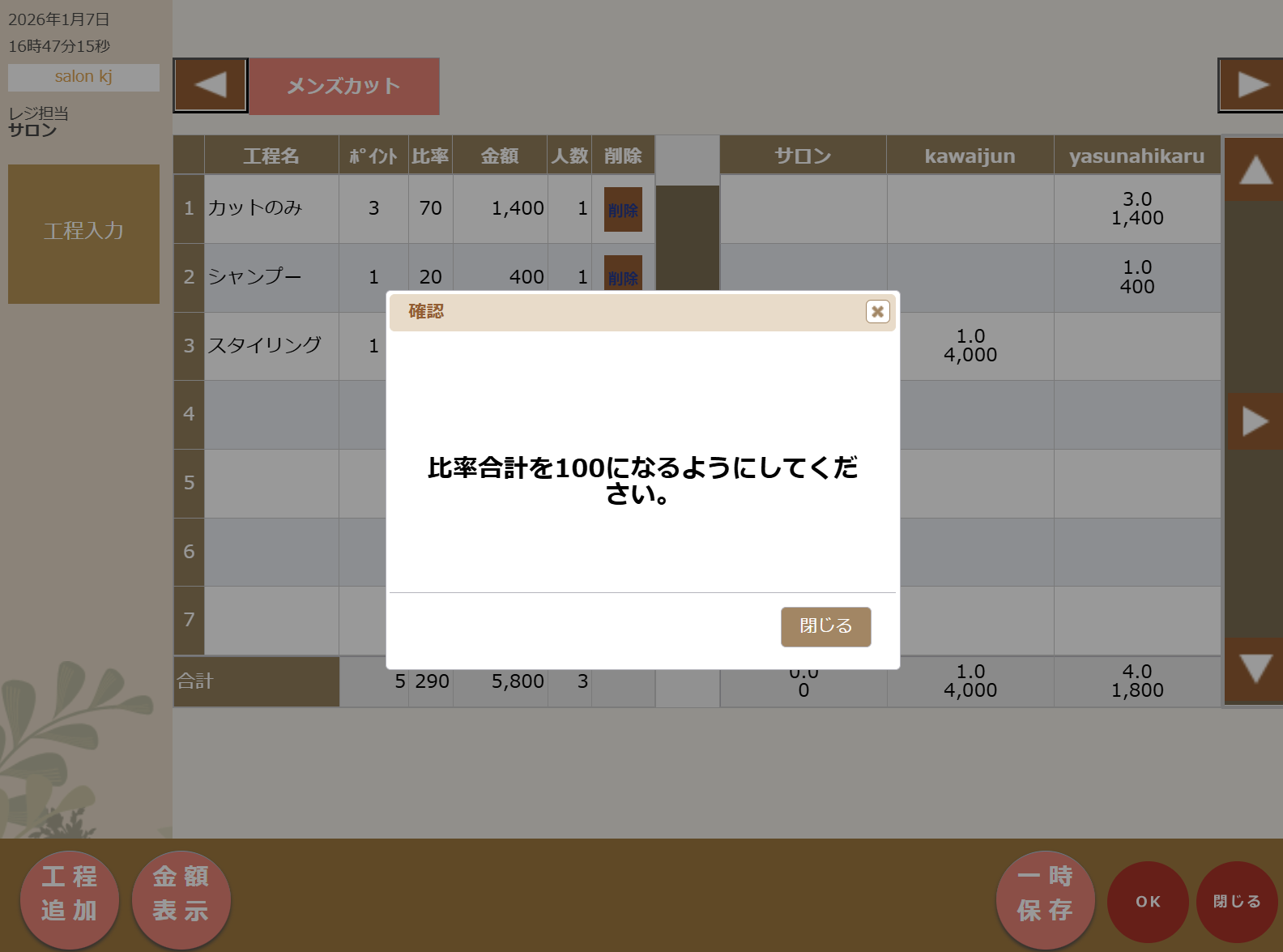 工程の料金比を計算する際のサロンの取り分を設定できます。(技術メニューの料金から算出されます。)