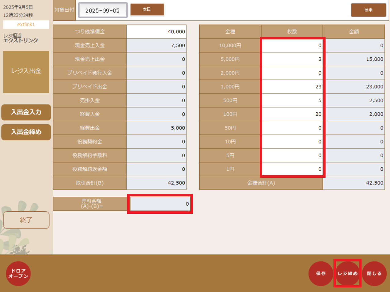 金庫に残っている各金種の枚数を入力し、「レジ締め」をタップで完了。