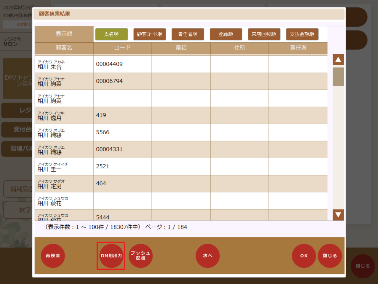 ハガキなどに用いる顧客情報(顧客名・住所)の出力を行う機能です。※CSVでの出力です。印刷等する場合は、A4プリンターが接続されているPCの管理画面(サロエボ)よりDM発行していただくとスムーズです。