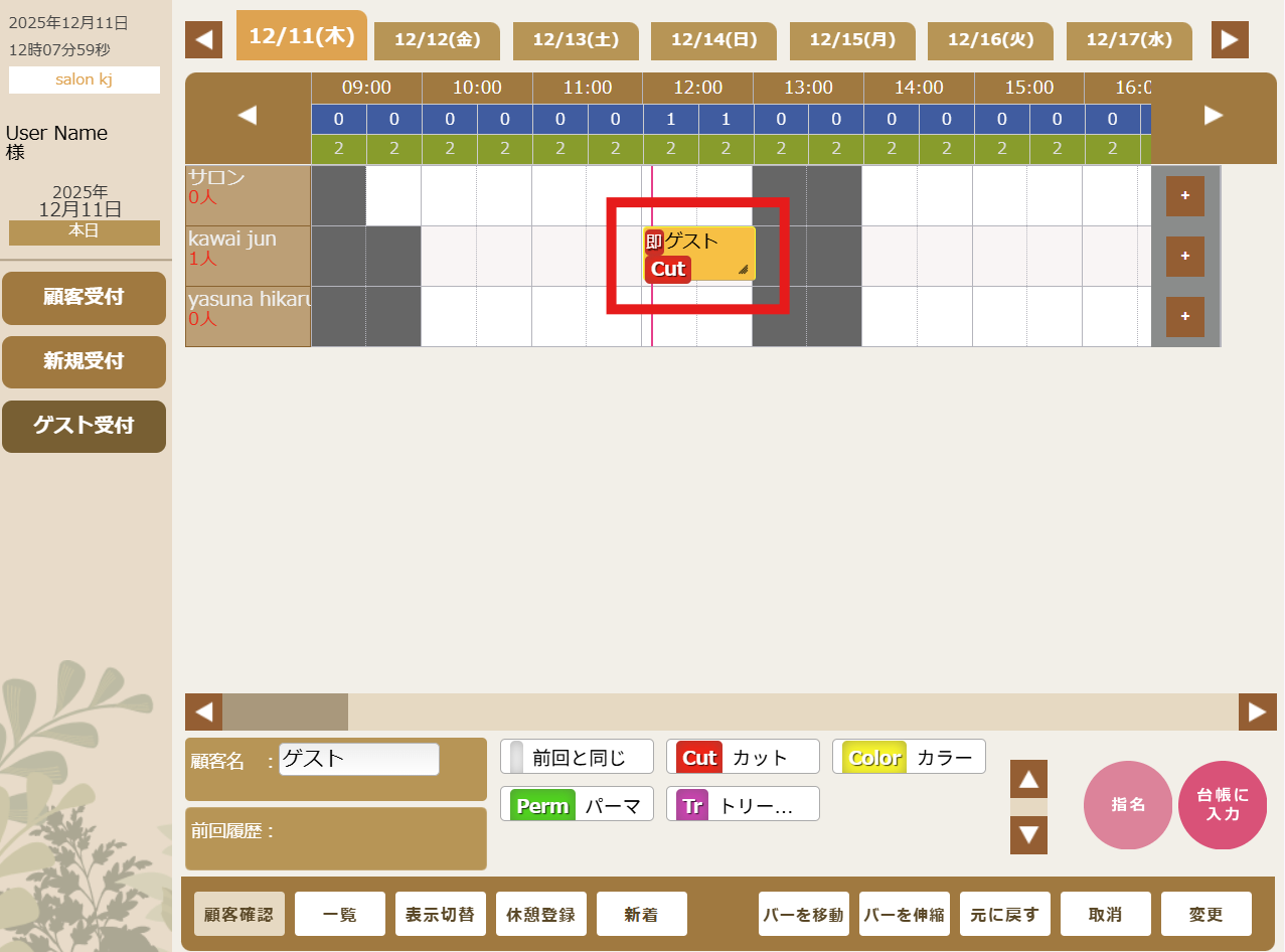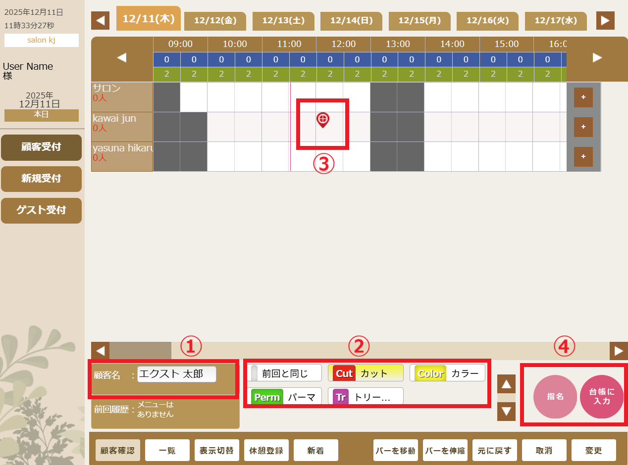 ①顧客名を確認。②施術カテゴリを選択します。③担当者・予約日・予約時間を選択します。※選択すると赤ピンが付きます。④【台帳に入力 】 をタップし完了です。※指名予約の場合は【 指名 】 を選択し【台帳に入力 】をタップ。