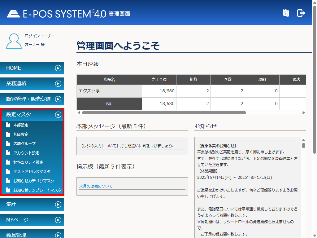■締め日の設定・管理画面にログインする際のマスターID/パスワードを設定できます。