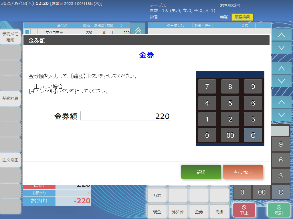 会計時に金券を選択した場合、会計金額が自動的に入力される機能です。
