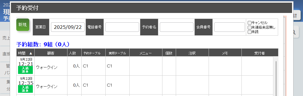 予約受付に事前予約されていない入店テーブルを「ウォークイン」として表示する機能です。