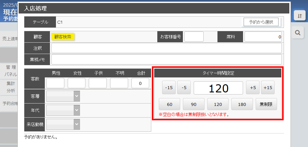 入店設定でタイマー時間設定をした場合に、時間切れを通知する機能です。
