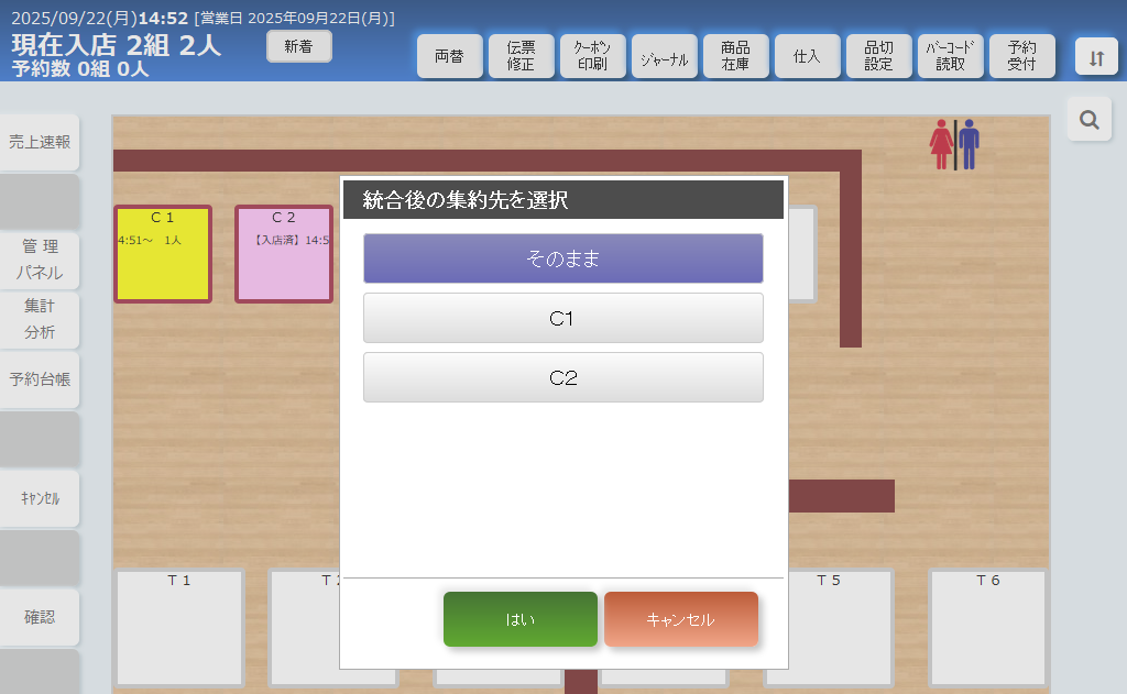 選択したテーブルを統合した後、テーブルをまとめるかどうかが選べます。 |
