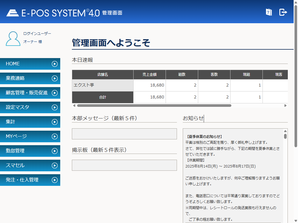 本日速報、本部メッセージ、掲示板、お知らせが表示されます。